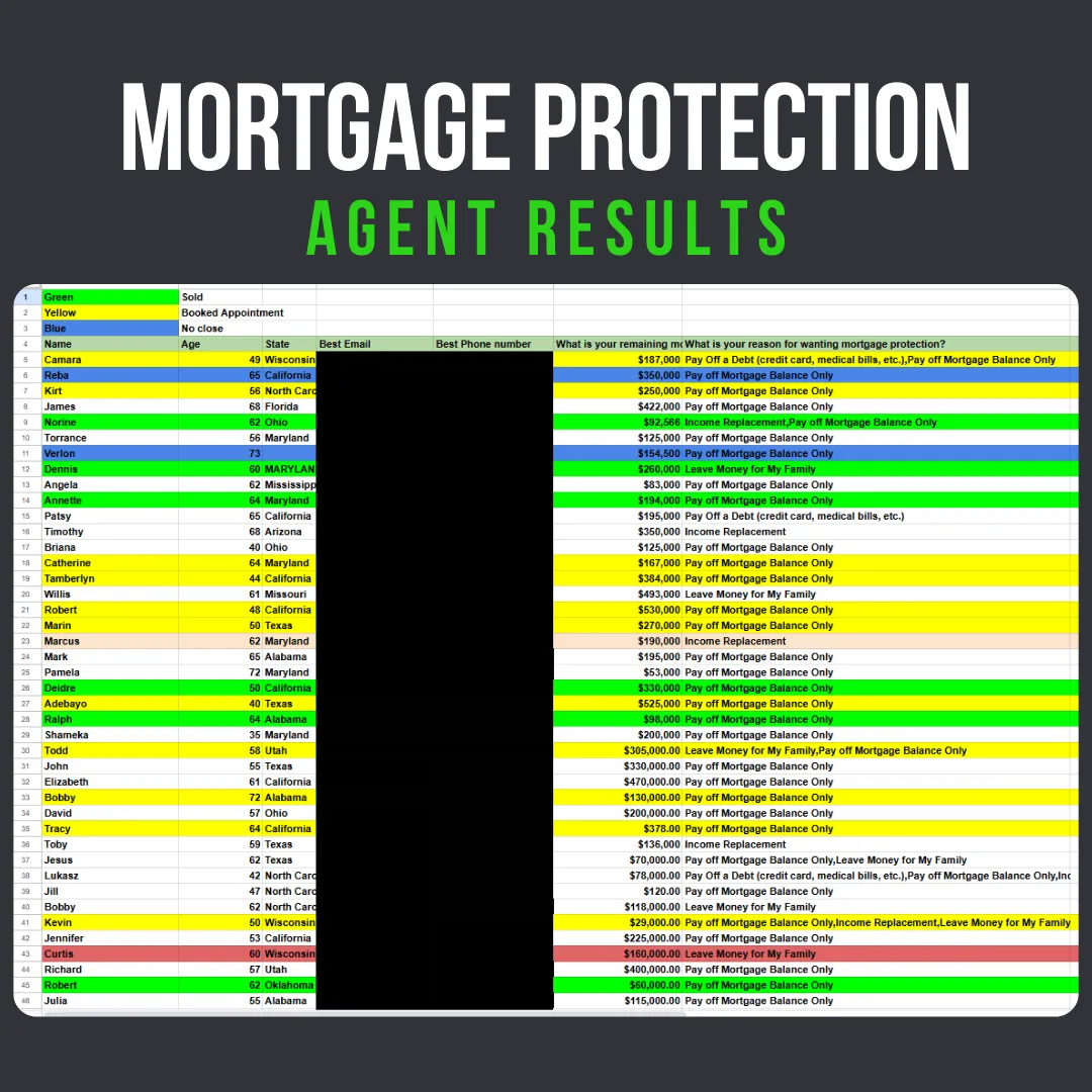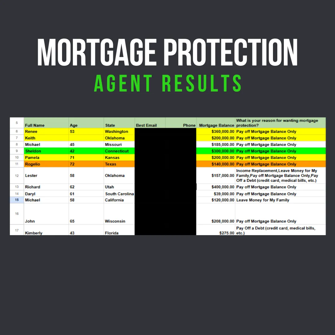 Data Fields: Name | Phone | Email | State | Age | Remaining Mortgage Balance | Reason For Wanting Coverage